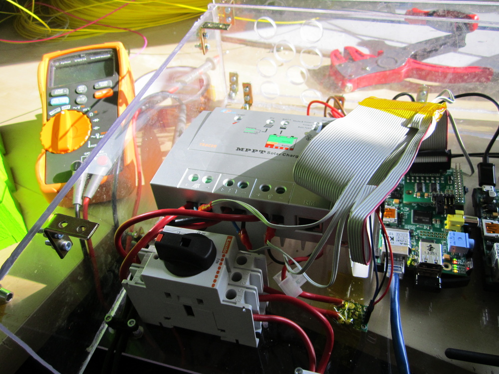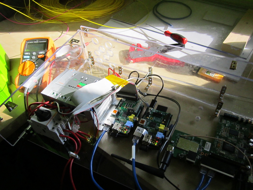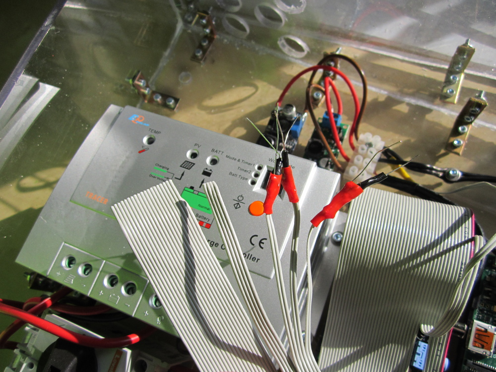 Remember my sunpowered Pi installation on the balcony ? The only indication I had, since recently, on how well the system is doing was an LED blinking red when battery was low. Not really helpful in making predictions or making measurements over the time. I've searched for simple ADC solution to hook up into Pi and allow for some voltage and power measurements. I've decided on ADC Pi, as it seemed very straightforward in its design and also comes with example python code. Did I say Python ?! It turns out that Python has an excellent graph plotting library as well as it is very well equipped with general purpose functions and hardware specific stuff support, like i2c. But back to the system design. The solar panel itself can generate up to about 30V under no load. Battery is 12V nominal but can get to 14.5V when charging, the specs say. ADC Pi however, can measure up to 5V. You have some resistors laying around you say ? Voltage divider it is. For current measurement I've used hall effect sensor module from Pololu. Summarising, I have 8 measurement lines, hooked up as follows: